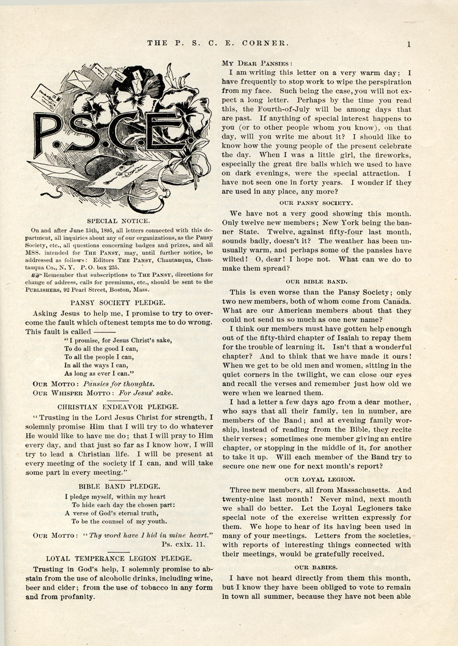THE PANSY~July 1895 Issue Edited by Isabella M. Alden “Pansy,” & G. R. Alden “The Pansy” included quite a varied selection of illustrated fiction, educational articles, devotional aids, Activities, and Christian Bulletins, contributed by various authors. Here are a few links to interior elements in the magazine: Daily