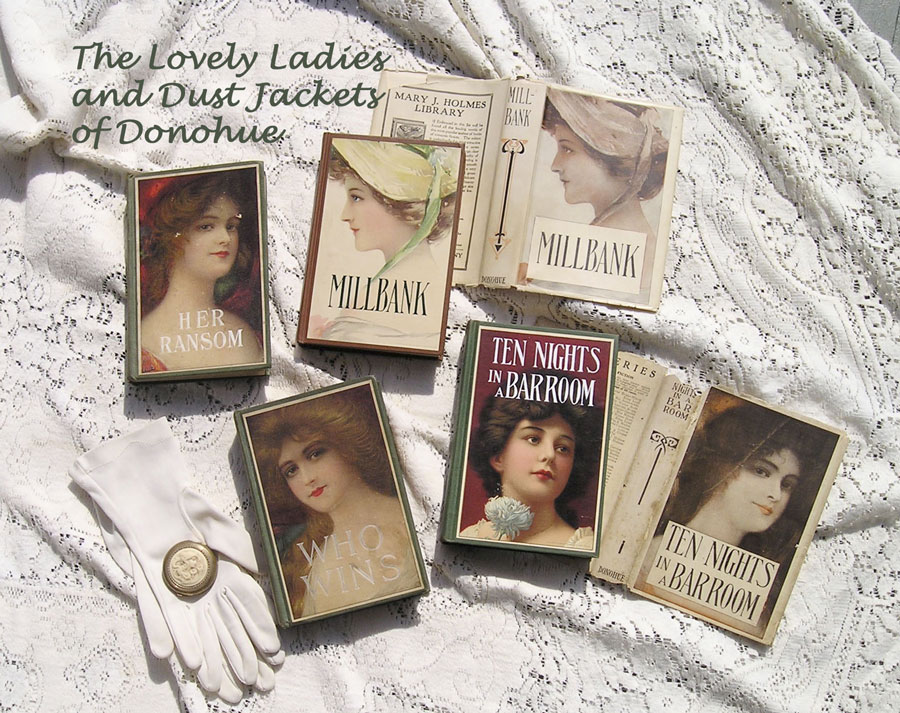 Cheaper reprint publishers like Donohue, printed some superbly beautiful images of lovely Victorian and Edwardian ladies on their book covers near the turn of the last century. The Dust Jackets often used the same, or similar illustrations in slightly muted colors. |